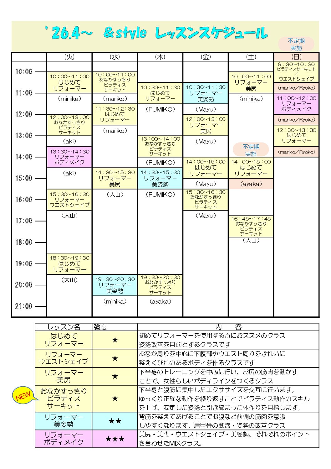 2026年4月よりレッスンスケジュールリニューアル 2026.04.01 マシンピラティススタジオ「&style」のホームページをご覧いただき誠にありがとうございます。 2026年4月より、レッスンスケジュールがリニューアルしました!人気インストラクターによる午前中レッスンの増設!経験豊富なRyokoインストラクターが新たに加わり、不定期だった日曜日レッスンの実施回数が増えました! 是非たくさんのご参加お待ちしております。 一覧に戻る